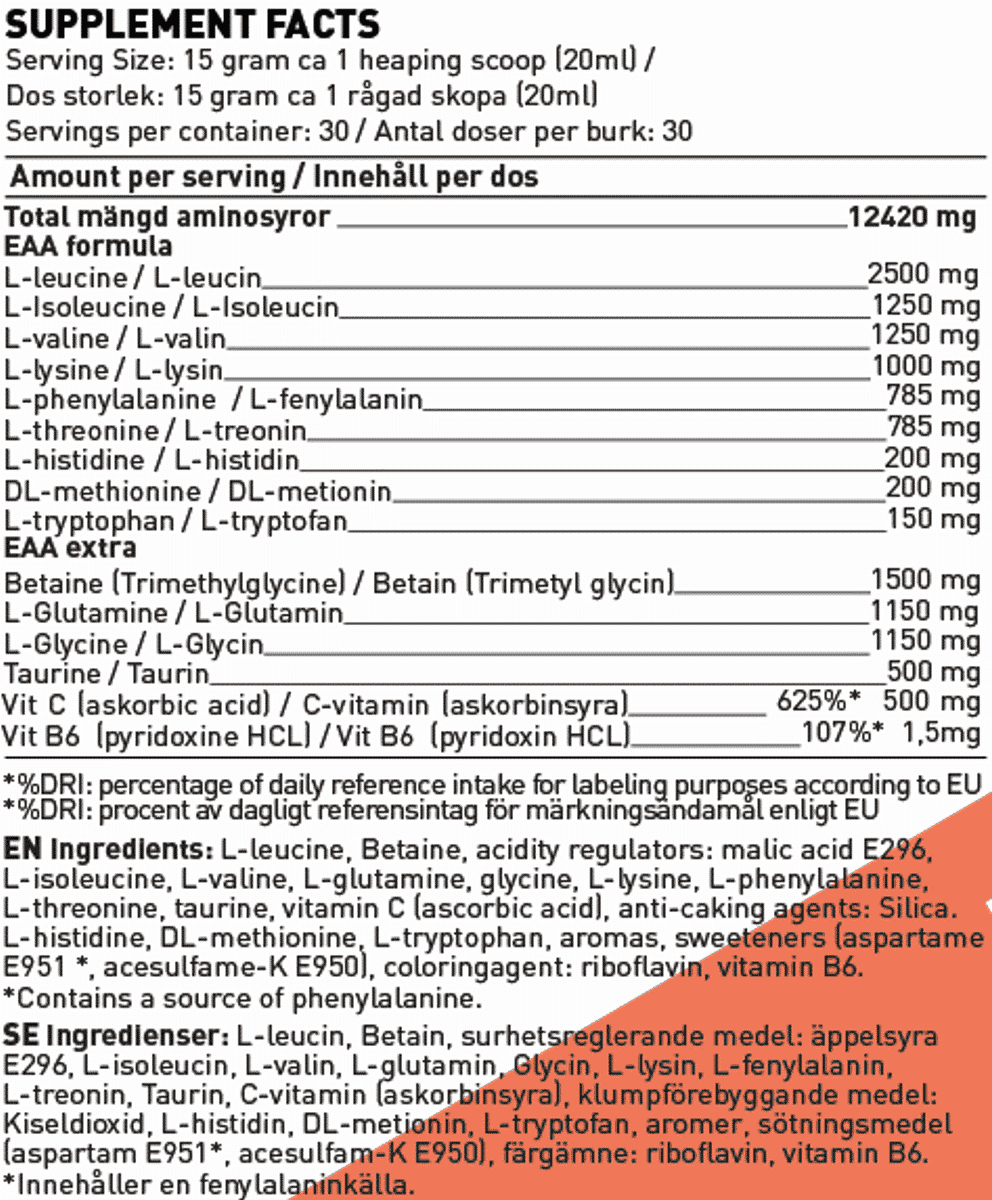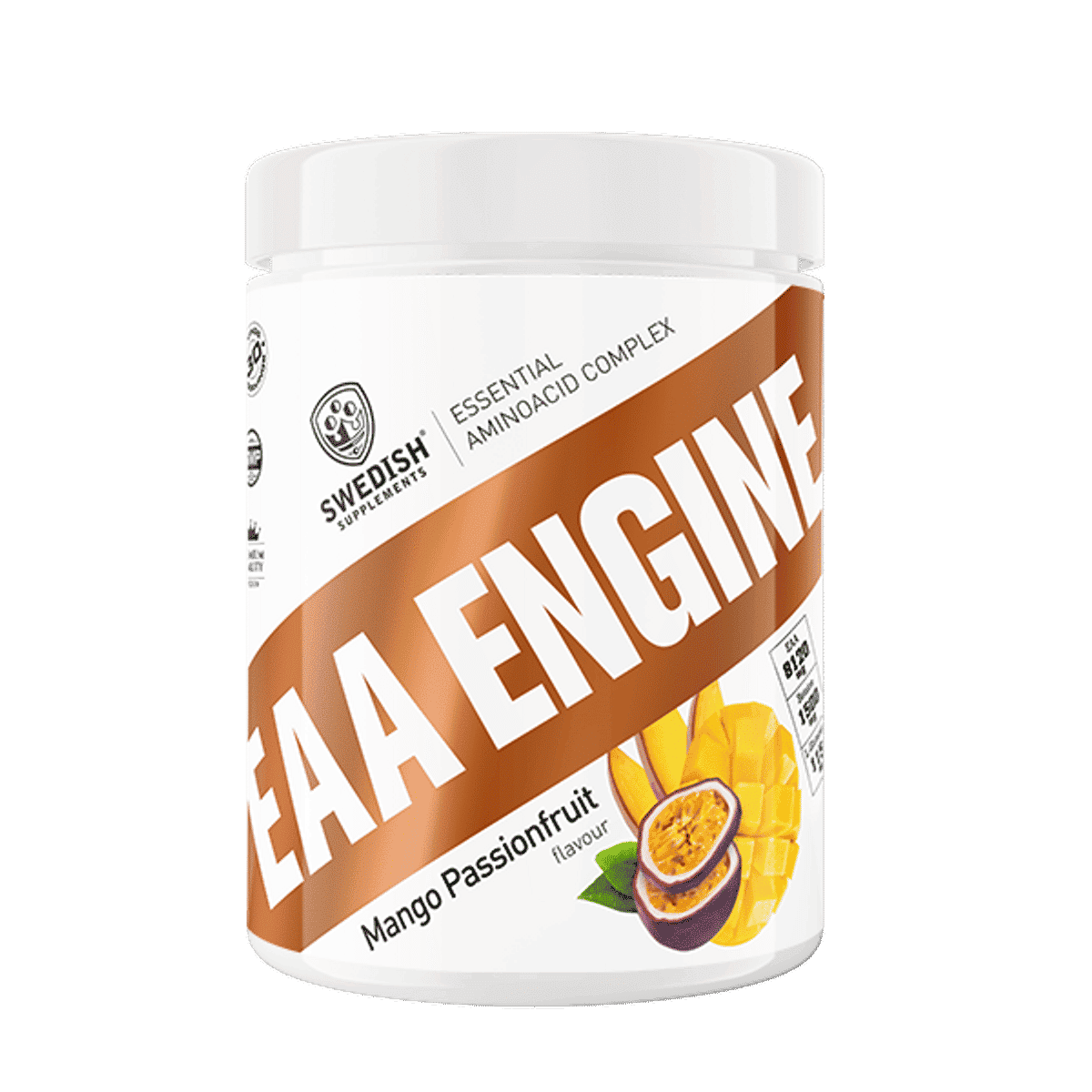 EAA Engine fra Swedish Supplements er en nøye sammensatt blanding av 8 essensielle aminosyrer EAA, dvs. aminosyrer som må tilsettes gjennom mat siden kroppen ikke kan syntetisere dem. Aminosyrene er i såkalt fri form, det vil si at de ikke trenger å bli fordøyd av kroppen på samme måte som med et protein, men kan tas opp direkte i blodet. Hvis noen eller alle de essensielle aminosyrene mangler i kroppen, blir det en faktor som begrenser proteinsyntesen, og dette kan da svekke muskeltilpasningen til trening, med økt muskelnedbrytning og en negativ innvirkning på en rekke metabolske prosesser som resultat. Et EAA-supplement fyller tomrommet og holder kroppen din i en anabol oppbyggende status. I konseptet med EAA finnes det rikelig med de forgrenede aminosyrene BCAA.